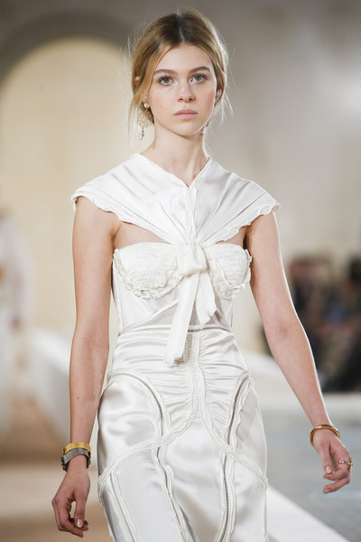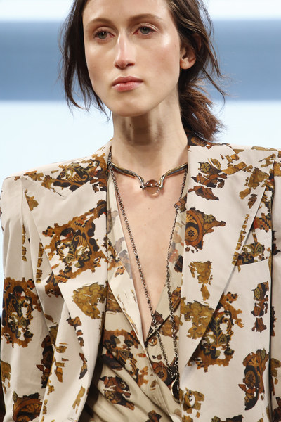 Alexander McQueen 2016春夏2.身体链延续着上一季春夏配饰的身体链,依旧是本季首饰潮流之一。在Calvin Klein Collection秀场上,缠绕在白色裙装外的层叠链条配饰与裙装形成鲜明的对比。除此之外,Alexander McQueen秀场上同样配有金属链条缠绕在时装外,呈现出具有层次感的叠戴风格,据说,这种造型的灵感来源于伦敦东部的胡格诺派教徒织布工。