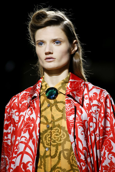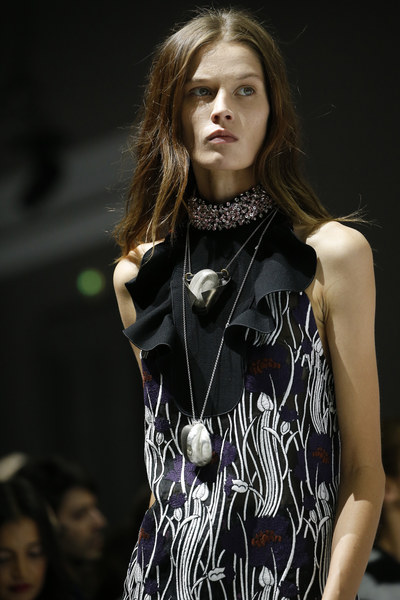 Dries Van Noten 2016春夏9.独一无二的胸针传统印象中,我们所了解到的胸针,都是将图案设计在衣着的表面之上。而对于2016年的胸针配饰趋势来说,则完完全全颠覆了这一传统。嵌入时装本身中的流线金属、水晶材质的纽扣、大号夸张的坠饰环形针⋯⋯Vionnet、Rochas和Dries Van Noten等品牌都像我们展示了一种更加符合当代审美的胸针设计趋势。