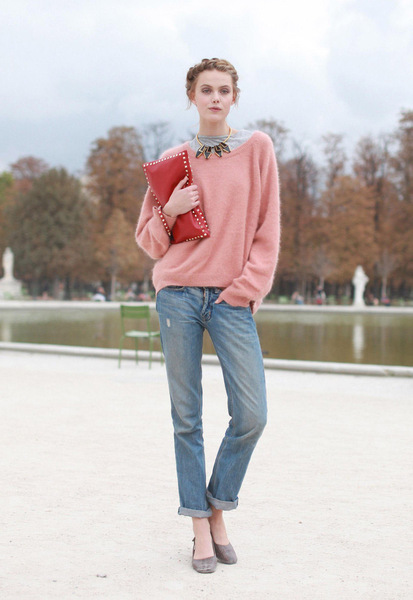 示范四:一字领针织衫+设计感项链 时髦人士最爱的搭配游戏