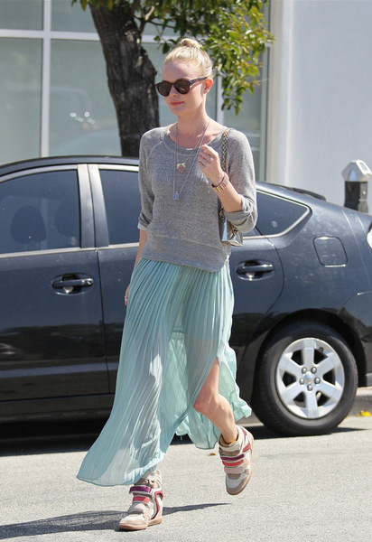 身材纤弱的Kate Bosworth穿起一字领针织衫更突显线条优美的锁骨,叠戴两条坠饰精美的长款项链更显得整个人气质精致不盈一握。