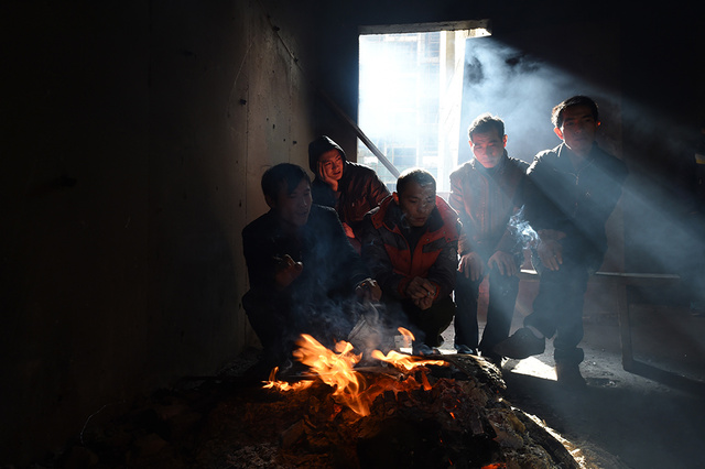 4/82015年1月8日,在山西太原市小店区西温庄乡西贾村,几位讨薪的农民工在一起烤火取暖。阳光从窗外打到他们身上,却不能带来丝毫暖意。新华社记者 燕雁 摄