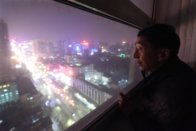 7/8黄宪委透过窗户向外张望(2015年1月9日摄)。来自河南信阳、64岁的农民工黄宪委,为讨要已被拖欠3年、涉及50多名农民工的67万元工钱,住进位于郑州的中泛置业有限公司的老总办公室里一个多月。 新华社记者 李博 摄