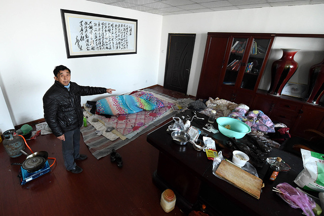 5/8河南中泛置业有限公司的办公地点已经人去楼空,黄宪委一家人只能暂时住在这里,等待老板回来给钱(2015年1月10日摄)。新华社记者 李博 摄