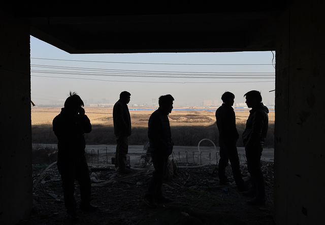 3/82015年1月8日,在山西太原市小店区西温庄乡西贾村,几位农民工在工地上焦灼地等待。不远处的城市建筑若隐若现。新华社记者 燕雁 摄