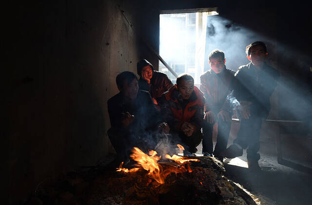 4/82015年1月8日,在山西太原市小店区西温庄乡西贾村,几位讨薪的农民工在一起烤火取暖。阳光从窗外打到他们身上,却不能带来丝毫暖意。新华社记者 燕雁 摄
