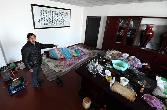 5/8河南中泛置业有限公司的办公地点已经人去楼空,黄宪委一家人只能暂时住在这里,等待老板回来给钱(2015年1月10日摄)。新华社记者 李博 摄