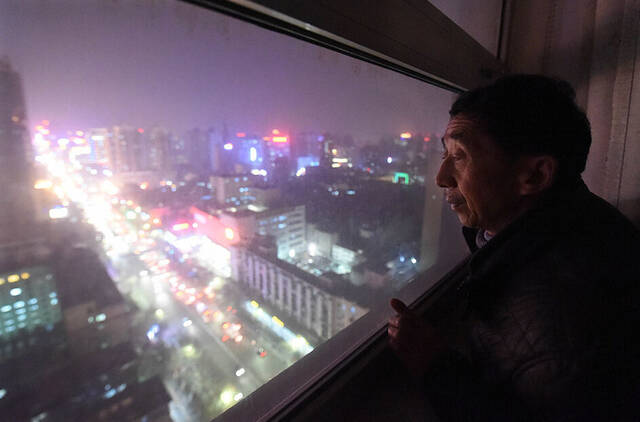7/8黄宪委透过窗户向外张望(2015年1月9日摄)。来自河南信阳、64岁的农民工黄宪委,为讨要已被拖欠3年、涉及50多名农民工的67万元工钱,住进位于郑州的中泛置业有限公司的老总办公室里一个多月。 新华社记者 李博 摄