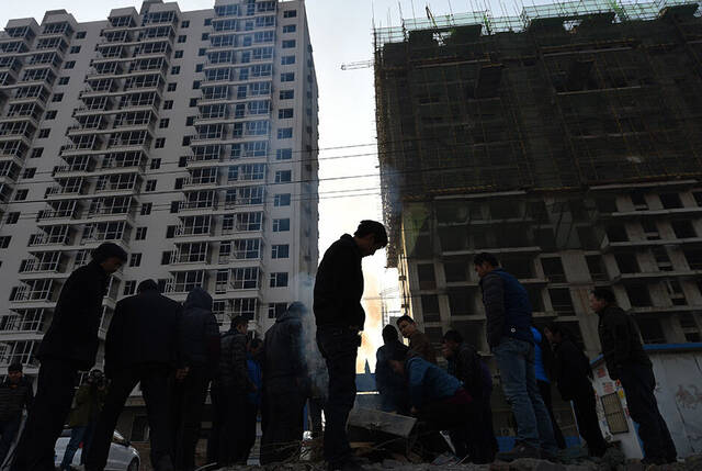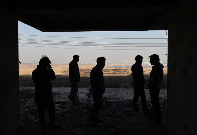 3/82015年1月8日,在山西太原市小店区西温庄乡西贾村,几位农民工在工地上焦灼地等待。不远处的城市建筑若隐若现。新华社记者 燕雁 摄