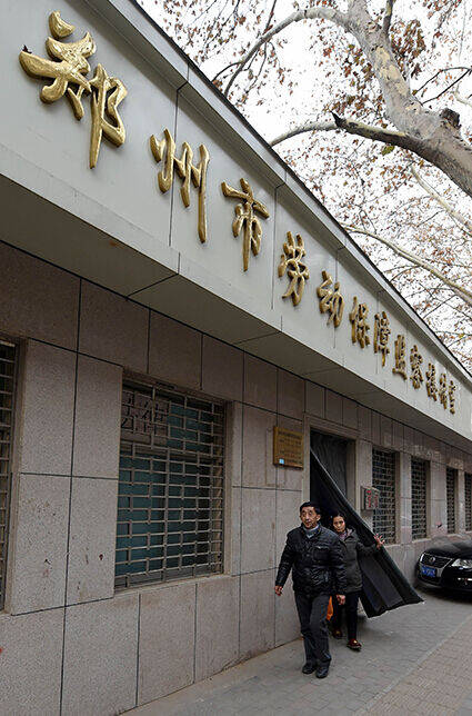 8/8黄宪委和老伴来到郑州市劳动保障监察接待室反映欠款情况(2015年1月9日摄)。来自河南信阳、64岁的农民工黄宪委,为讨要已被拖欠3年、涉及50多名农民工的67万元工钱,住进位于郑州的中泛置业有限公司的老总办公室里一个多月。新华社记者 李博 摄