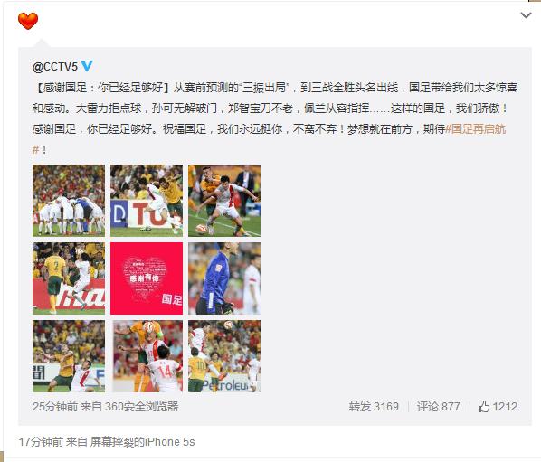 【感谢国足:你已经足够好】从赛前预测的“三振出局”,到三战全胜头名出线,国足带给我们太多惊喜和感动。大雷力拒点球,孙可无解破门,郑智宝刀不老,佩兰从容指挥……这样的国足,我们骄傲!感谢国足,你已经足够好。祝福国足,我们永远挺你,不离不弃!梦想就在前方,期待#国足再启航#!