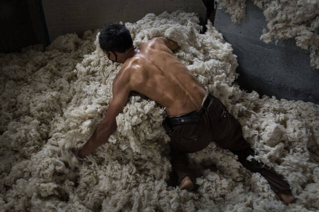 6/202014年7月12日,福建漳州,工人们正在处理从澳大利亚进口的羊毛,这些羊毛将被送往工厂进行加工漂白等。羊毛加工制作而成的服装鞋帽将出口至西方市场,也会满足国内消费。