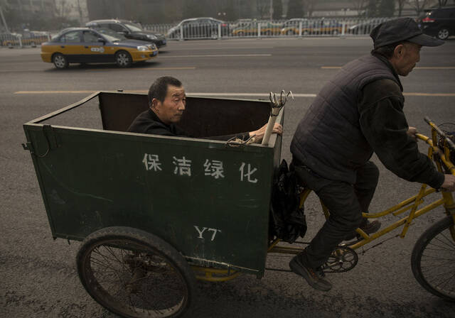 10/202014年3月26日,北京雾霾天,一名农民工坐在一辆垃圾车内。