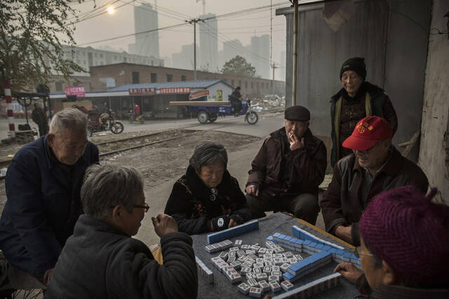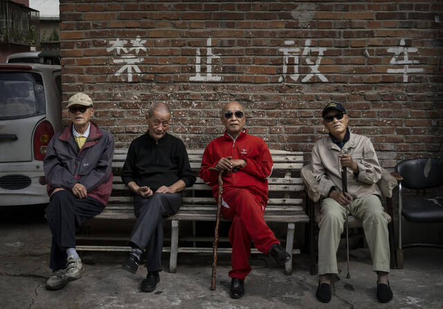 16/202014年10月2日,北京,几位老人坐在公寓外的长椅上。