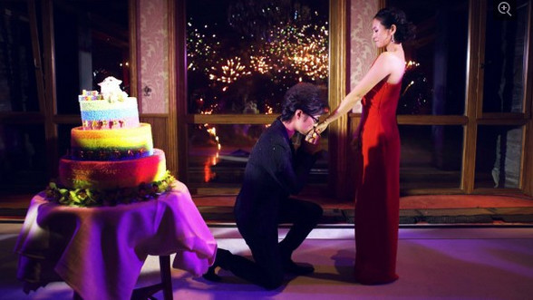 在众多亲友的尖叫声和祝福掌声中,章子怡先是惊喜万分,而后感动落泪,坚定地说出“我愿意”,亲友报以热烈的掌声。在汪峰求婚的同时,通过二人身后的落地窗还能看到窗外燃放的绚烂烟花。求婚成功的汪峰激动呐喊,两人相拥共赏烟花。