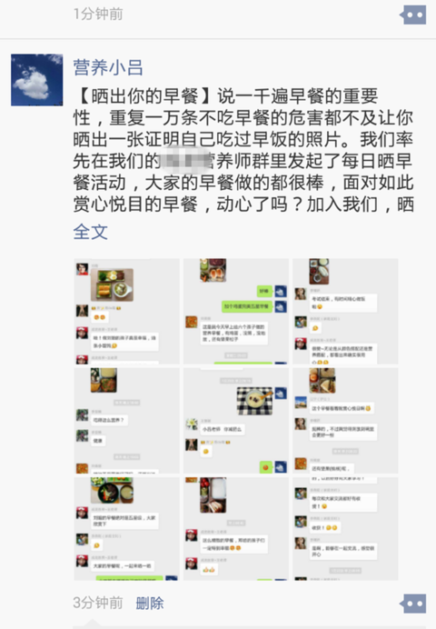 4.其实刚刚讲到的做一份赏心悦目的早餐问题,关键还是在于坚持,往往很多人都是新鲜劲过了又不想坚持了,这里小吕建议大家开一个微博或者加一个朋友群,把自己每天的早餐照晒出来,坚持做一份好的早餐不仅需要对自己和家人浓厚的爱,还需要大家的鼓励和赞美。