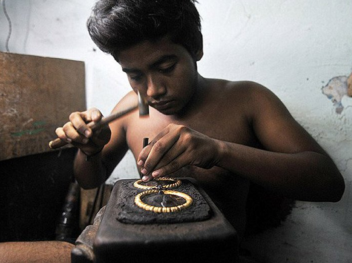 一名金匠正在加尔各答店铺中使用黄金打造手镯。