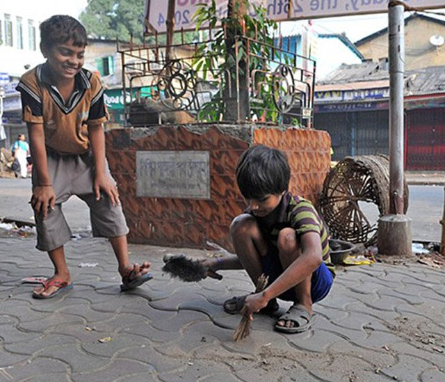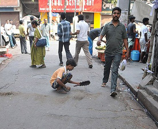 萨鲁说:“我已经从事这一行3年了,现在都成了专家。我收集一切东西,尘土、垃圾以及石头等。我将金屑卖给金匠换取报酬。”加尔各答珠宝街上,像萨鲁这样12岁左右的男孩数代以来就靠在街边和珠宝店附近的下水道口筛选污物寻找微小金屑为生。