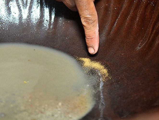 在碗底可以看到一小堆金粉,它们是从珠宝街的尘土中筛出来的。 这些孩子也会在珠宝店附近的下水道口筛选污物,寻找微小金屑,卖给回收的金匠。儿童清扫珠宝街的街头尘土和下水道中污泥可以筛选出黄金。