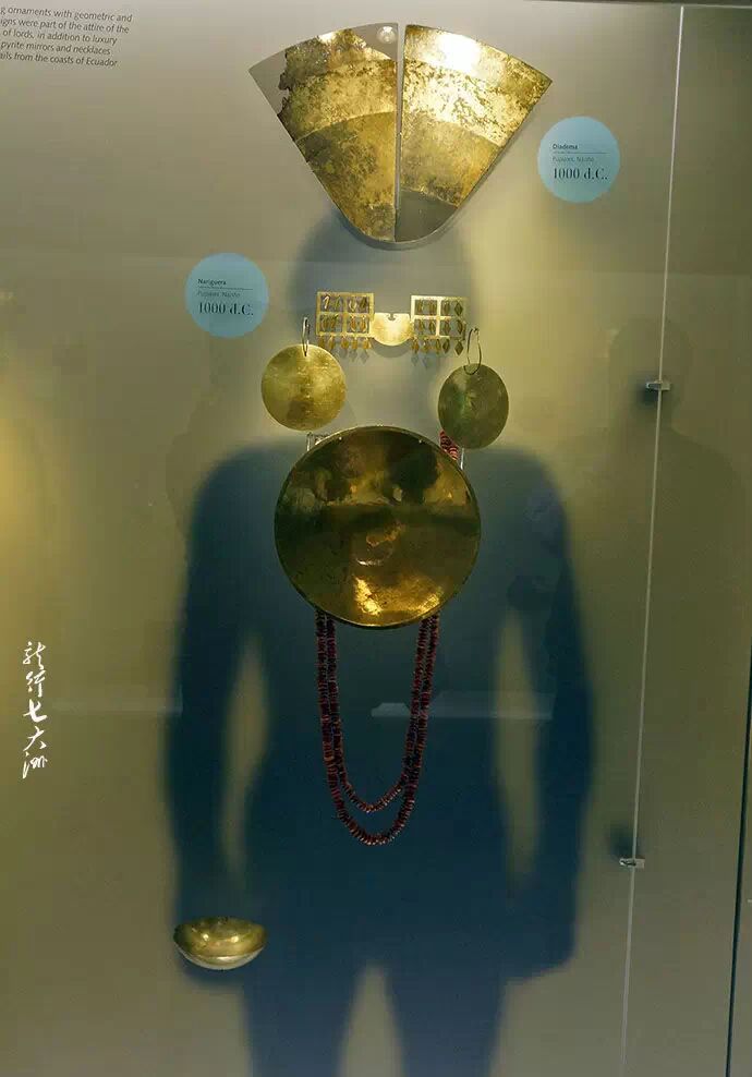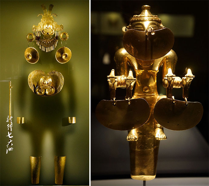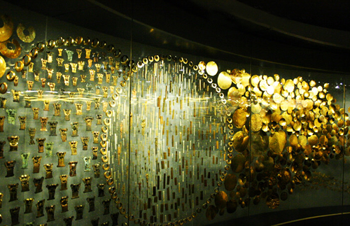 最珍贵的黄金饰物放在顶楼一间密室内。最引人注目的地方是博物馆的“黄金大厅”。这里陈列着数以百计的黄金珍品,大厅门口警卫森严。游览者必须分批进去,每批不得超过20人。人们刚迈进大厅时,厅内漆黑一片,伸手不见五指,突然间,灯火通明,只见眼前金光闪闪,如同阿里巴巴走进四十大盗的金银珍珠的宝库一般,令人眼花缭乱,目不暇接。厅内四周玻璃柜内各种黄金珍品琳琅满目。现代的观众更幸运,当你一走进大厅,大厅内就响起了优美悦耳的印第安音乐,在悠扬动人的乐曲声中,人们会疑惑自己是否进入了神话的“黄金世界”。