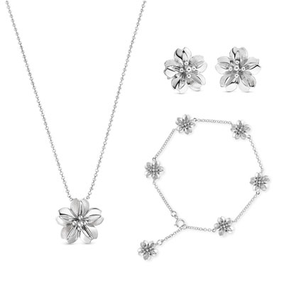 用纯净和永恒的铂金打造出奔腾的水流和寓意永恒的樱花,自然流露出欢乐的情绪和两人间爱的力量,并在设计中加入折纸的现代元素,象征着婚后夫妻彼此感谢并一同走下去的坚定信心。