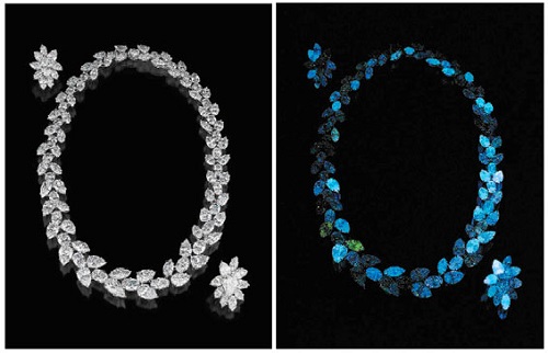 下图的项链就是利用了钻石的荧光反应而做出的别出心裁的设计,是不是很漂亮?