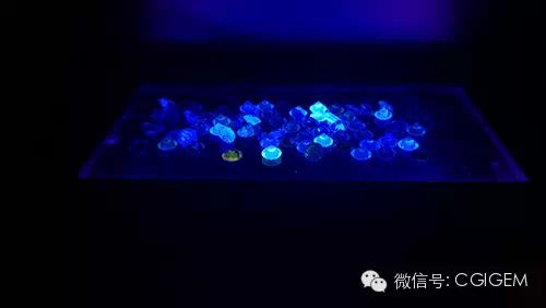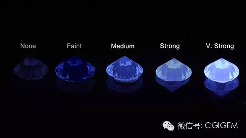钻石中荧光种类最常见的是不同强度的蓝白色荧光,GIA根据荧光的强度将其划分为5个等级(无至极强)。